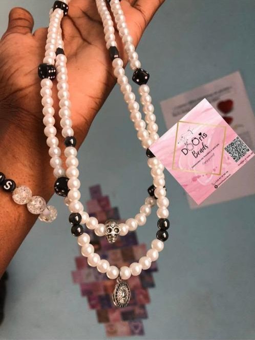 Magnifique ceinture de perles, élégamment conçue pour ajouter une touche sophistiquée à toute tenue. Composée de perles blanches brillantes entrecoupées de perles noires, cette pièce se distingue par ses détails raffinés.