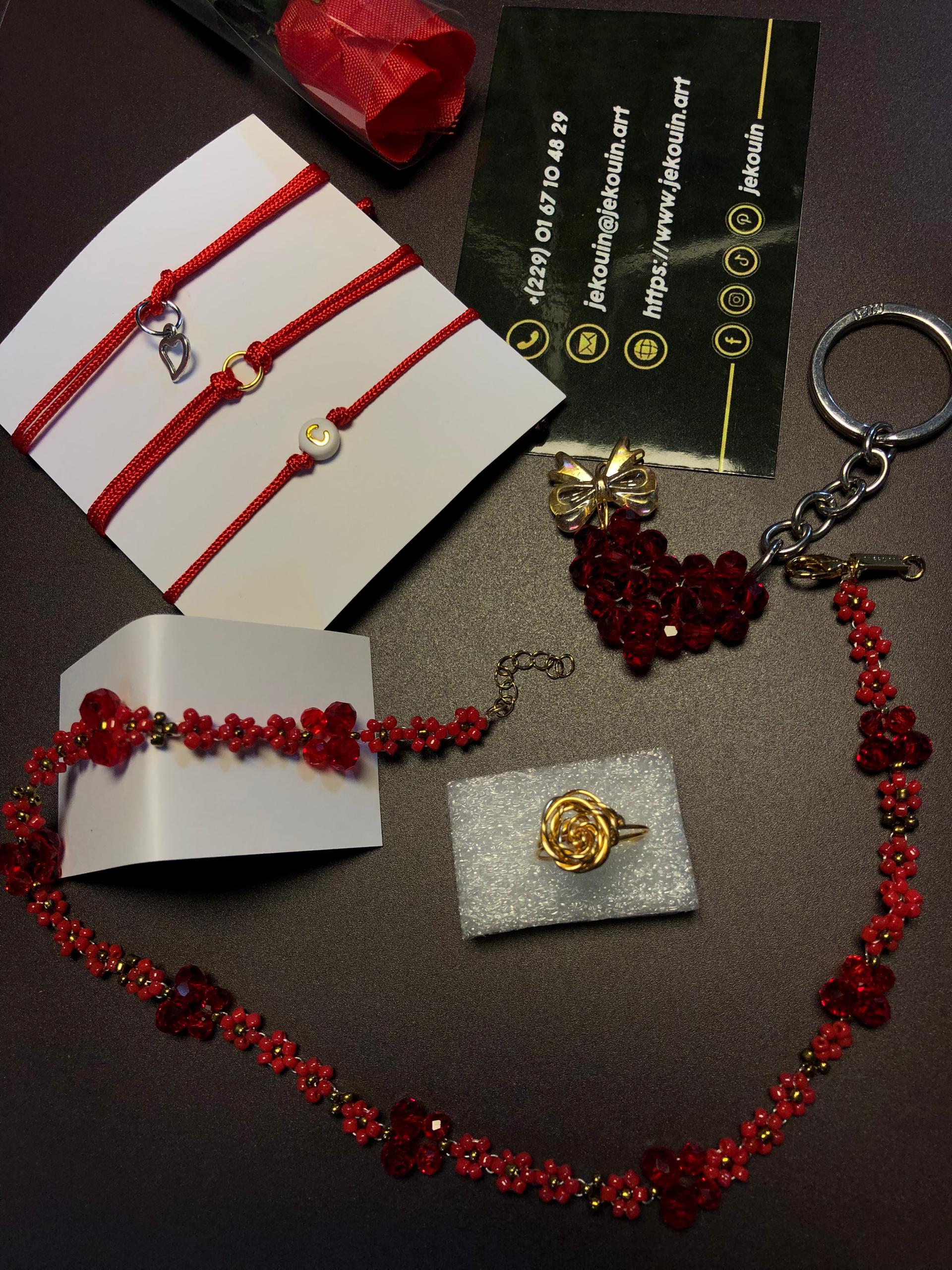 Ce coffret harmonieux se compose de plusieurs créations artisanales aux tons rouges profonds, symbole universel de passion et de romantisme. Chaque pièce a été soigneusement sélectionnée pour former un ensemble cohérent, à la fois délicat et intemporel.